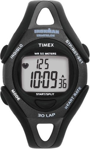 Timex Ironman Triathlon Heart Rate Monitor with a medium Grey and Black Resin Strap, INDIGLO night-light, Water Resistant to 50 meters, Alarm Features, 30 lap recall, Preset your desired heart rate zone, Displays average heart rate over a period of time, Amount of time spent within selected heart rate target zone, Computes calories burned, Measure heart rate after a timed recovery, Automatically sets five training zones, Digital FM transmission for clear signals.