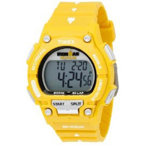 The bright yellow resin case and band of the Timex Men's IRONMAN 30-Lap Shock Gold Case and Resin Strap Sports Watch adds a colorful touch to this athletic watch. The gray dial features two time zone settings for easy travel as well as the day, date, and month across the top of the digital display. This watch includes 100-hour chronograph with split option, 30-lap memory recall, 99-lap counter, 24 hour countdown timer, countdown stop, countdown repeat, and alarm functions. The Indiglo nightlight and night mode features make this watch easy to read day or night. This Timex watch offers reliable quartz movement and is protected by a durable mineral crystal. The watch is water resistant to a depth of 660 feet (200 meters).